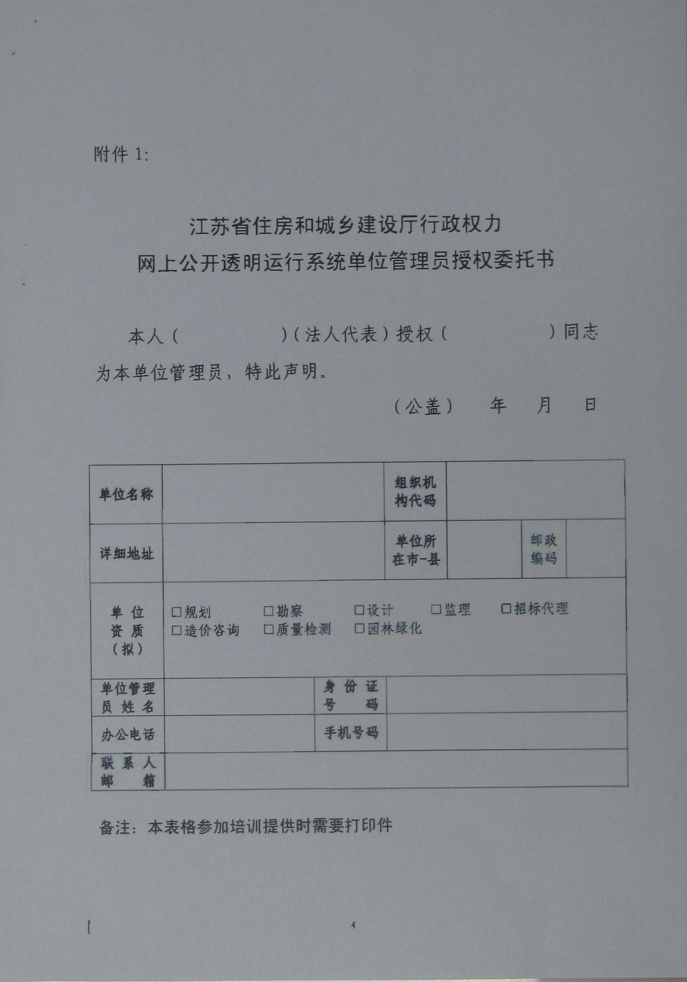 附件1:江苏省住房和城乡建设厅行政权力网上公开透明运行系统单位管理员授权委托书