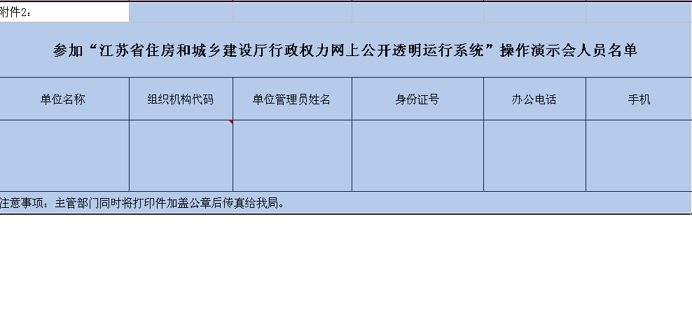 1、企业人员参加系统操作演示会时,应携带《江苏省住房和城乡建设厅行政权力网上公开透明运行系统单位管理员授权委托书》(附件1)、本企业的组织机构代码证复印件(加盖企业公章)。