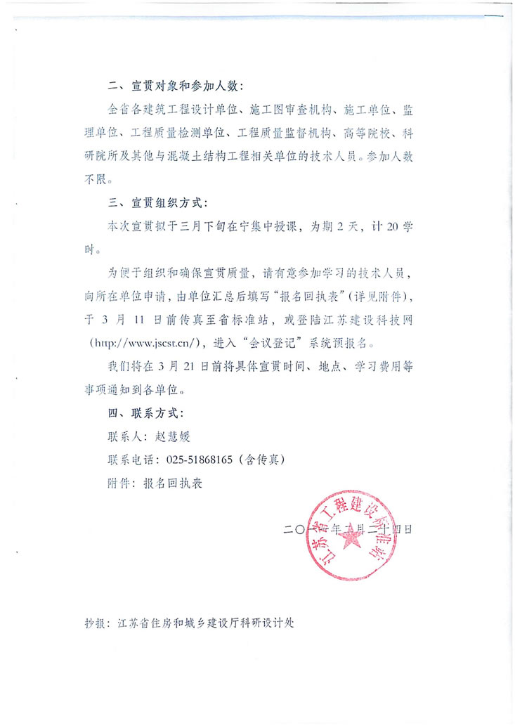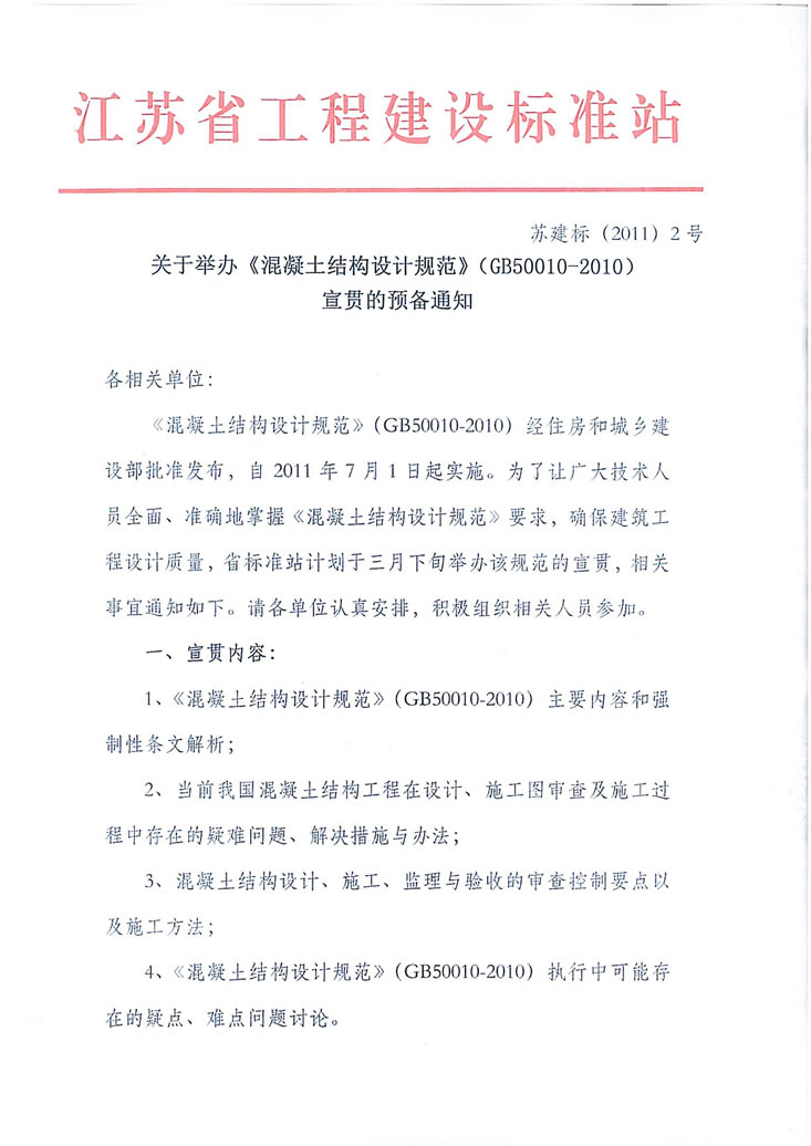 关于举办《混凝土结构设计规范》(GB50010-2010)宣贯的预备通知 苏建标[2011]2号