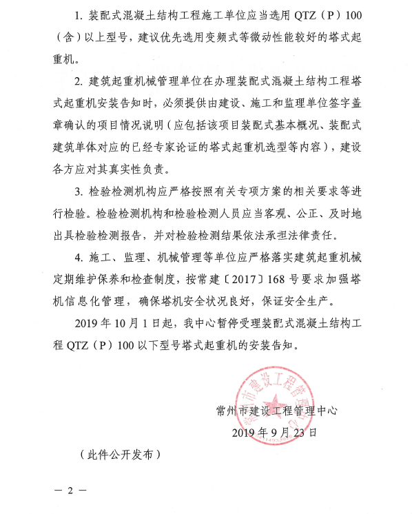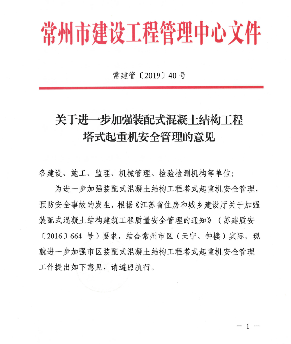 关于进一步加强装配式混凝土结构工程塔式起重机安全管理的意见(常建管[2019]40号 )