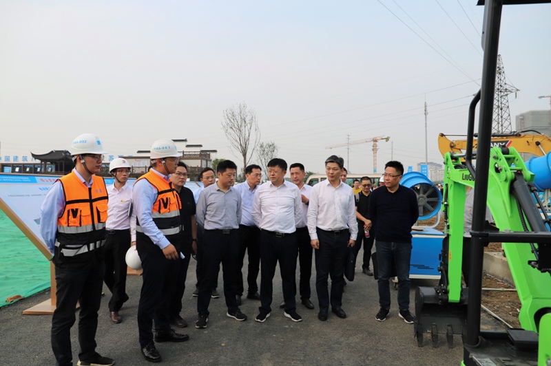 与会人员现场观摩了江理工项目扬尘防治标准化建设及特色亮点做法,对现场“六个百分百”措施,塔吊喷淋、高杆喷淋等新型抑尘设施,电动化工程机械、预制边坡支护、建筑垃圾减量化等绿色建造方式进行了现场交流学习。